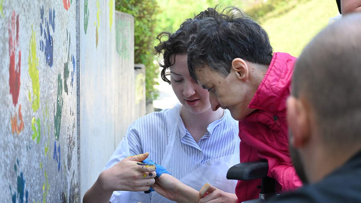 In den „Häusern im Eichenwäldchen“ in Ottweiler entwickelte sich vor kurzem ein einzigartiges Projekt, bei dem Bewohner*innen gemeinsam mit den Mitarbeitenden eine Außenwand der Einrichtung mit ihren Händen bunt gestalteten. Mit der Unterstützung der Mitarbeiter*innen tauchten die Bewohner*innen ihre Hände in kräftige Farben oder bemalten diese mit Pinseln, um sie anschließend auf der bereits vorbereiteten Außenwand zu verewigen. Entstanden ist nicht nur ein farbenfrohes Kunstwerk, welches wunderbar erstrahlt, sondern auch ein sichtbares Zeichen für Gemeinschaft und Zusammenhalt. Die Aktion brachte viel Freude und verstärkte zeitgleich das Miteinander von Bewohner*innen und Pflegenden. Der Vormittag sorgte für strahlende Gesichter bei allen Beteiligten.